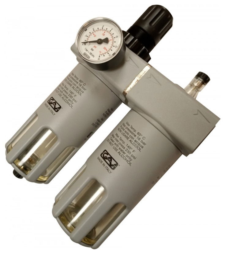 A levegőelőkészítő egység a szűrő-szabályozó-vízleválasztó és olajzó egységből áll össze.